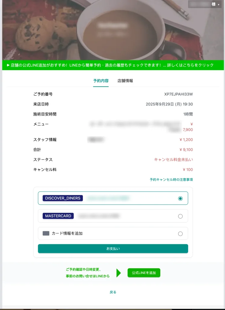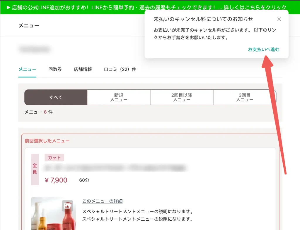 - 未払いの場合 : キャンセル料金を支払わないと、次回予約時にお知らせが表示され、予約サイトから予約ができなくなります