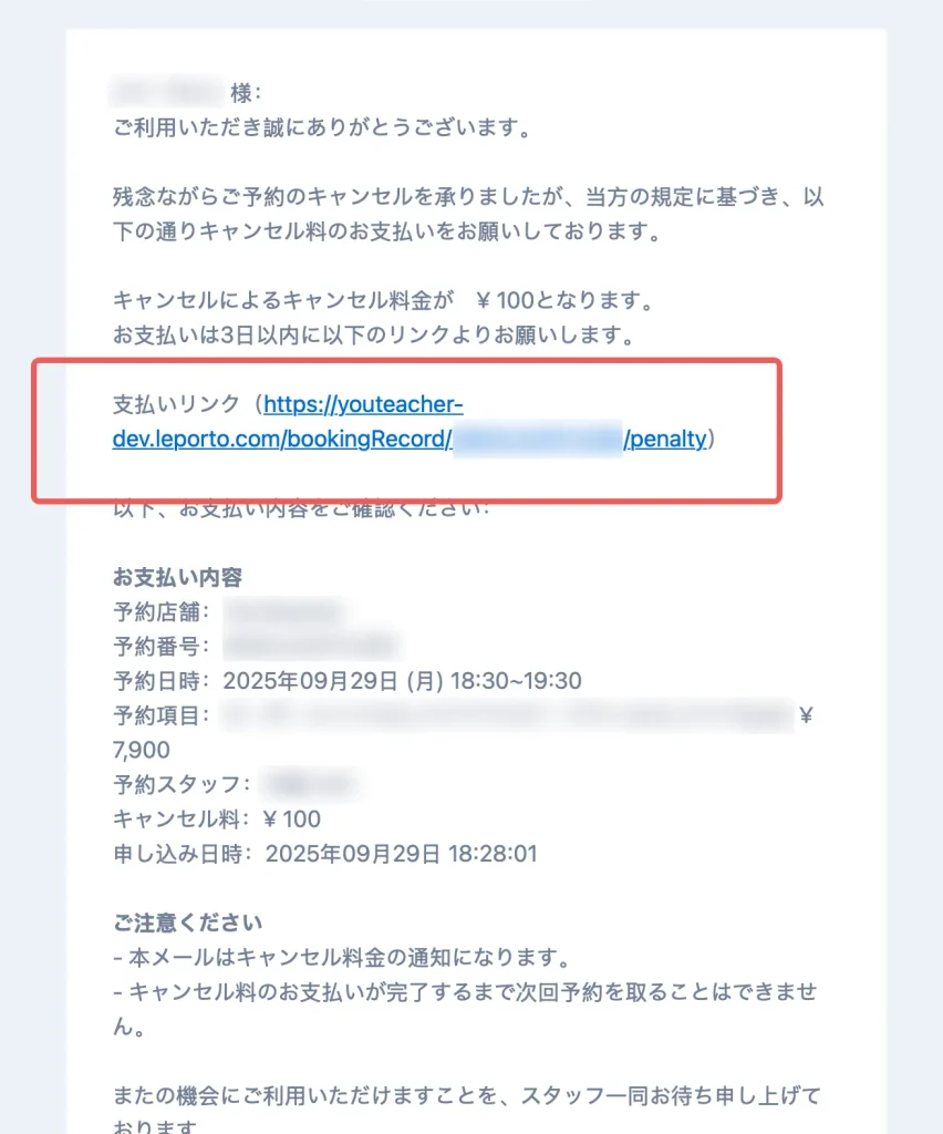 - メール送信 : キャンセル後、支払いリンクを含むメールが自動送信されます