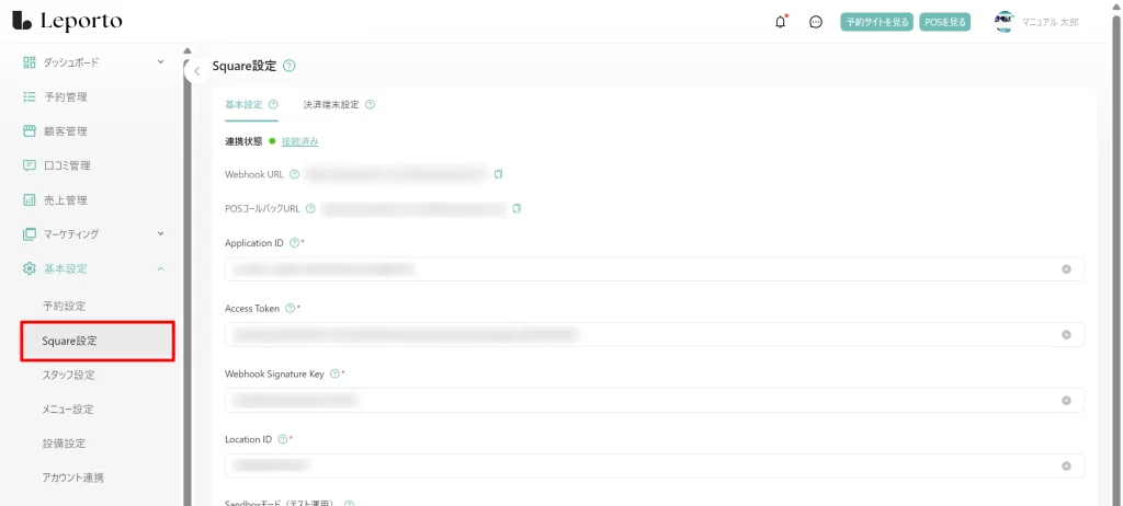 決済端末ID確認や支払い用アカウント設定等:Square通常管理アカウント