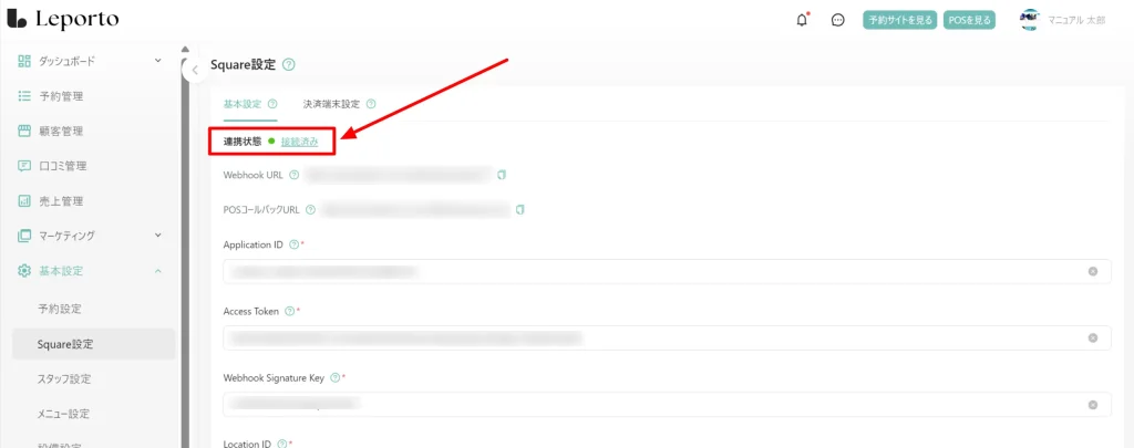 CMSのSquare設定画面で「連携状態」を確認してください。