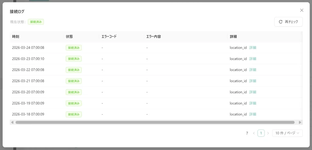 「接続済み」または「接続エラー」をクリックすると、接続ログの詳細を確認できます。