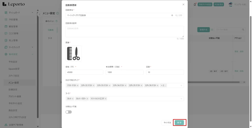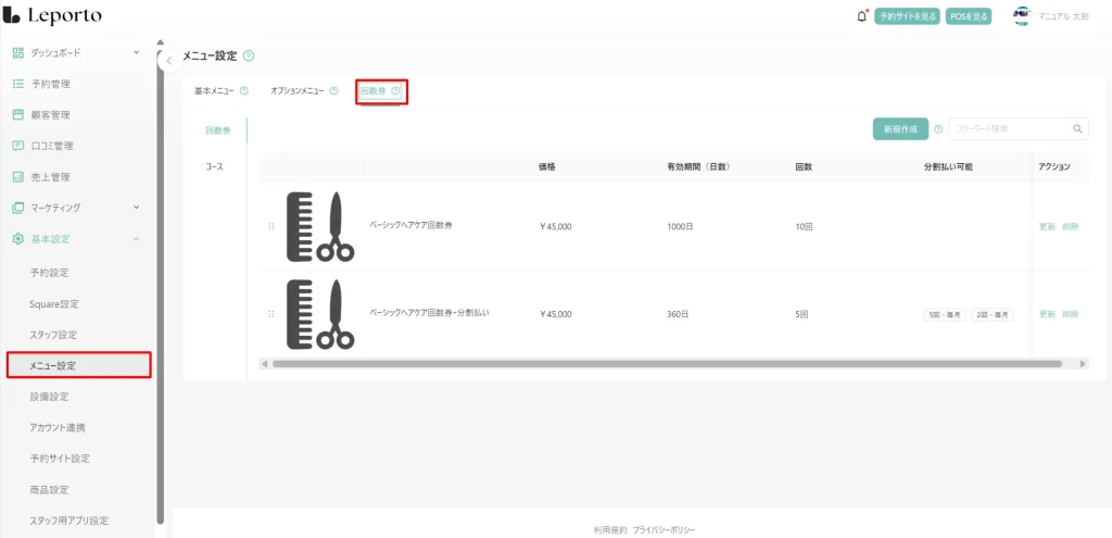施術メニューの詳細を定義(この画面で設定) - 回数券設定: