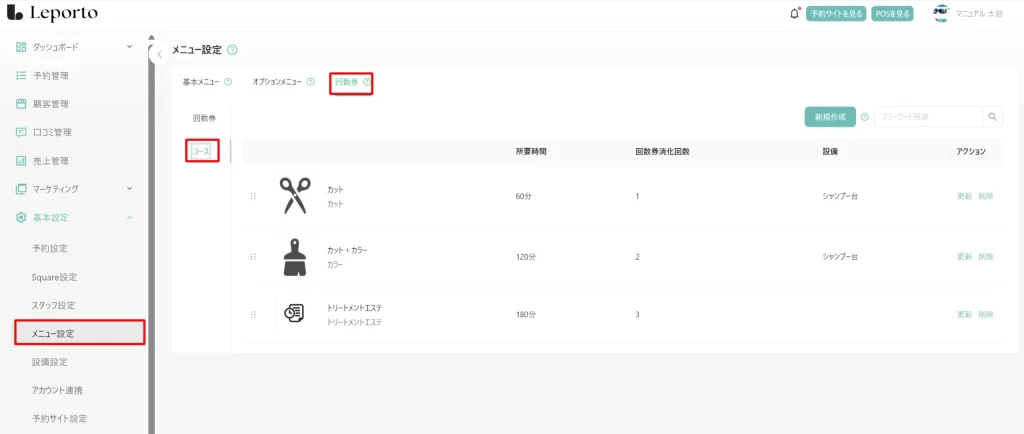 基本メニューの価格や所要時間などを設定していきます。