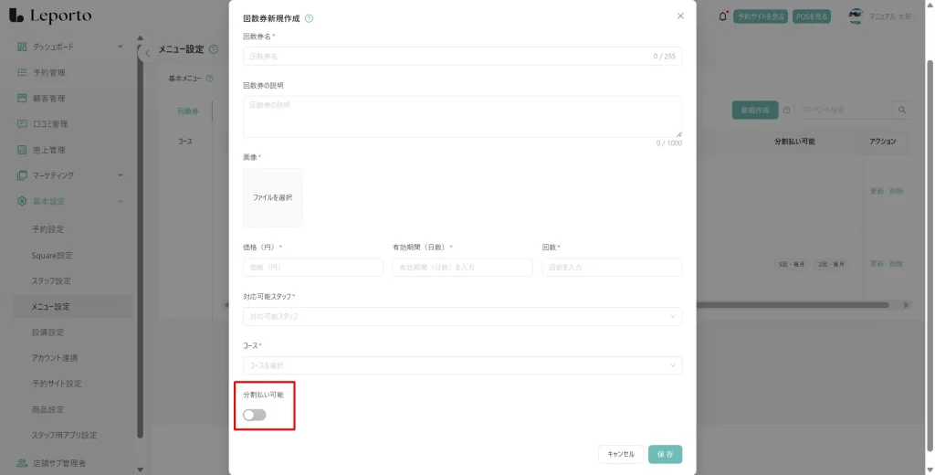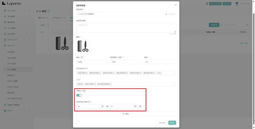 既存の回数券、または新規作成する回数券に対して、分割払いオプションを追加します。