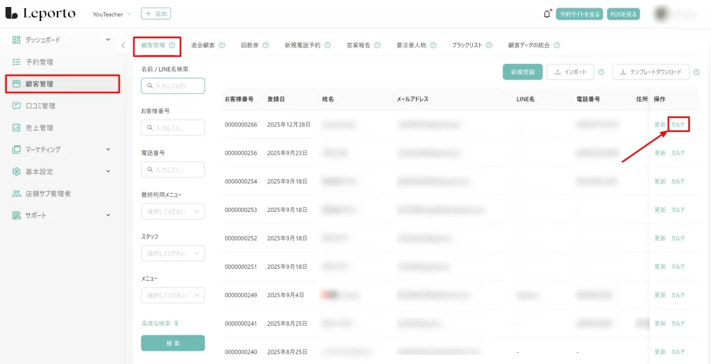 [顧客管理]→ 対象のお客様のカルテを選択