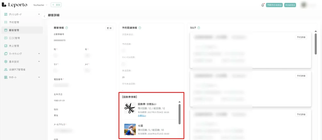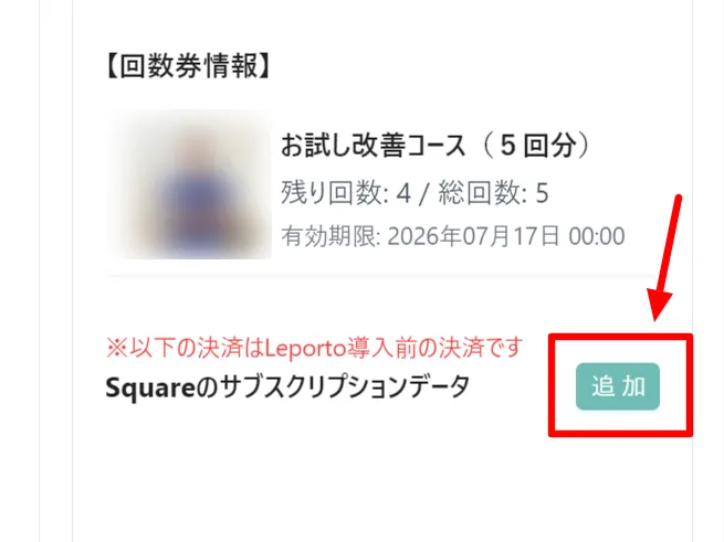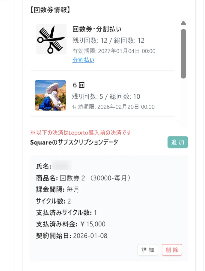 💡 「※以下の決済はLeporto導入前の決済です」と表示されている回数券は、Leportoではなく、Square側で直接作成された参考情報です。