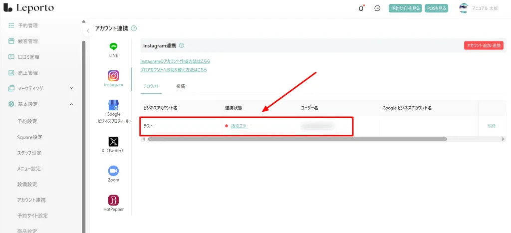 Leportoと連携しているInstagramのアカウントが表示されます。