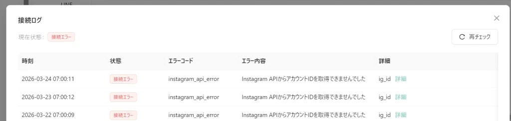 「接続済み」または「接続エラー」をクリックすると、接続ログの詳細を確認できます。