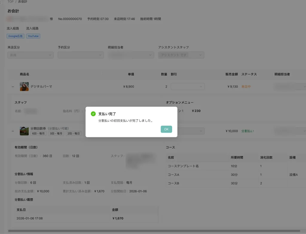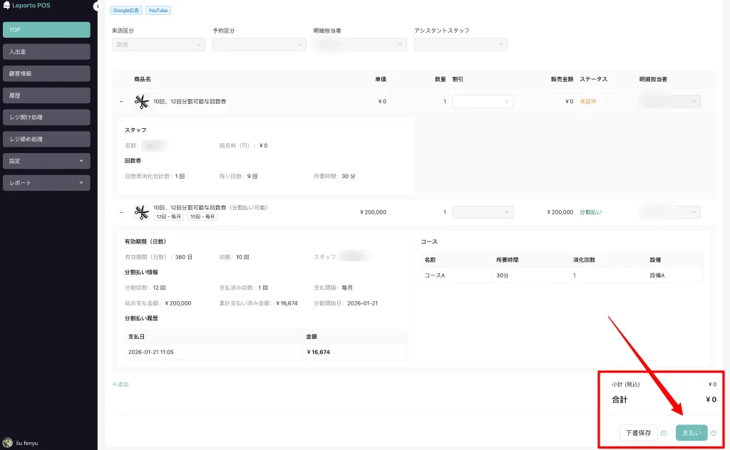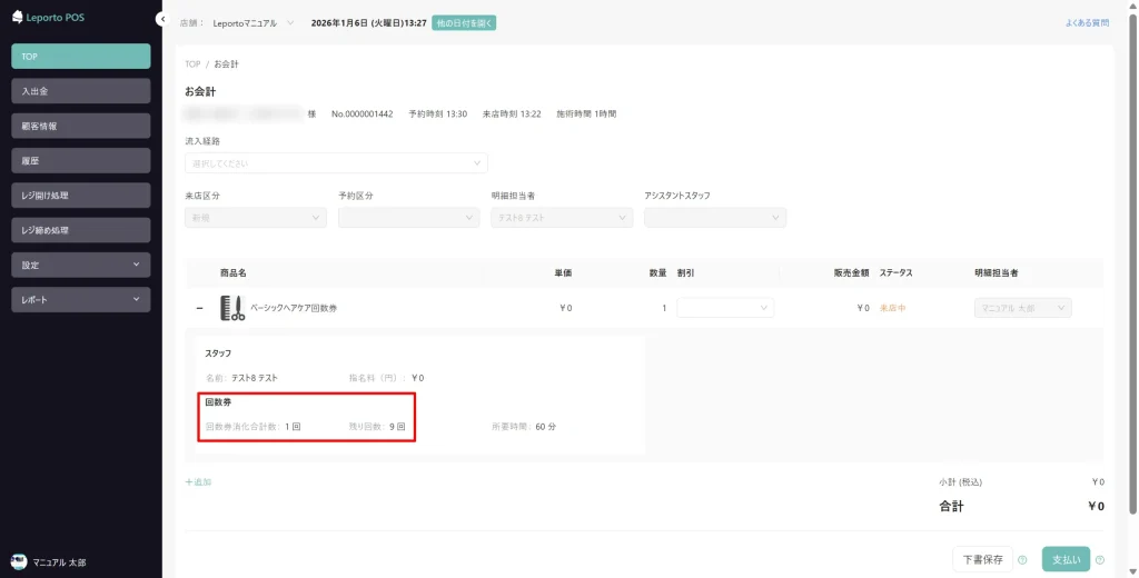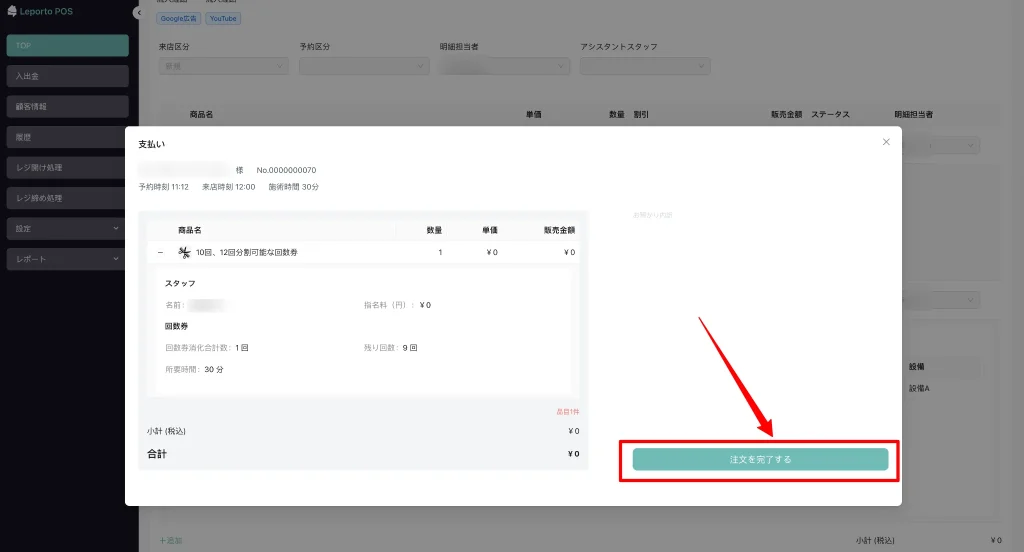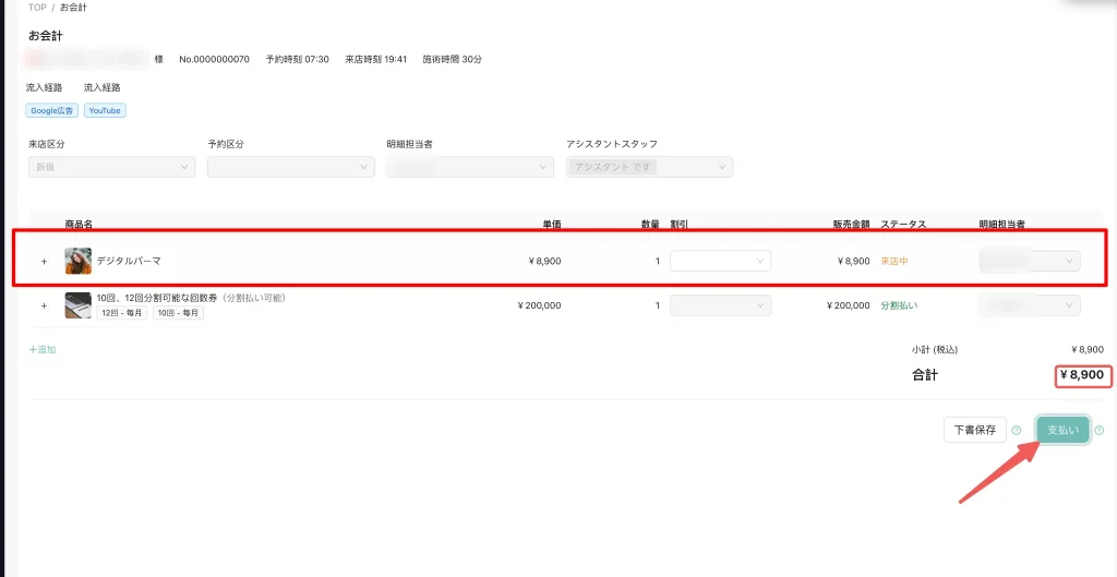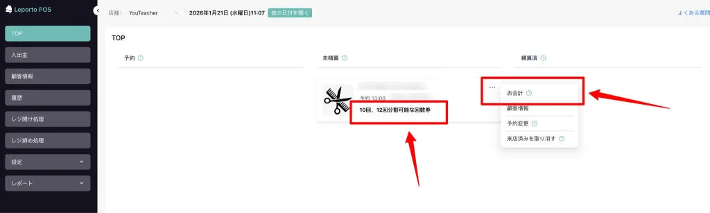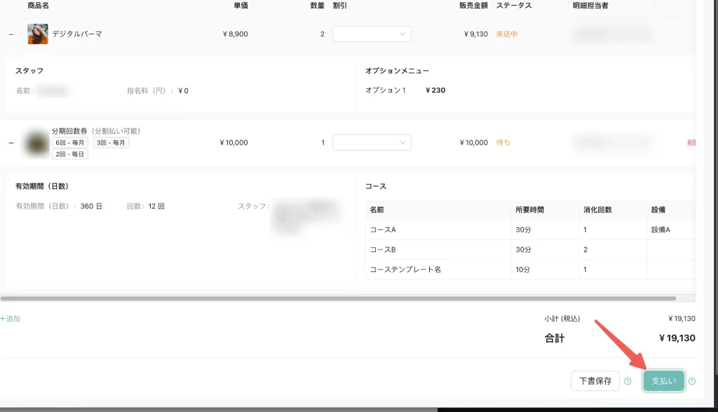 この時点で回数券の購入は完了していますが、当日の施術分(カットなど)の会計は未精算のままです