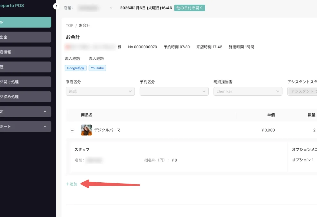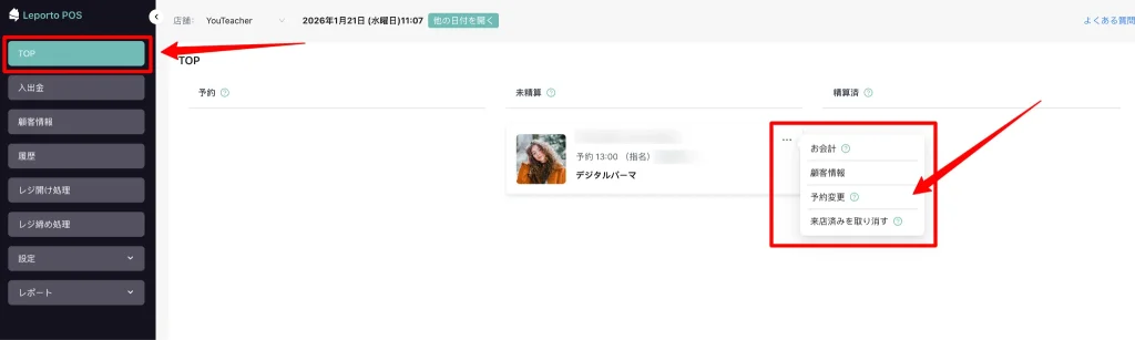 POSのTOP画面では、当日の予約確認から来店処理、お会計まで一連の流れを管理します。