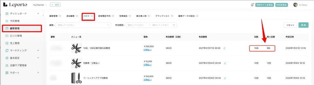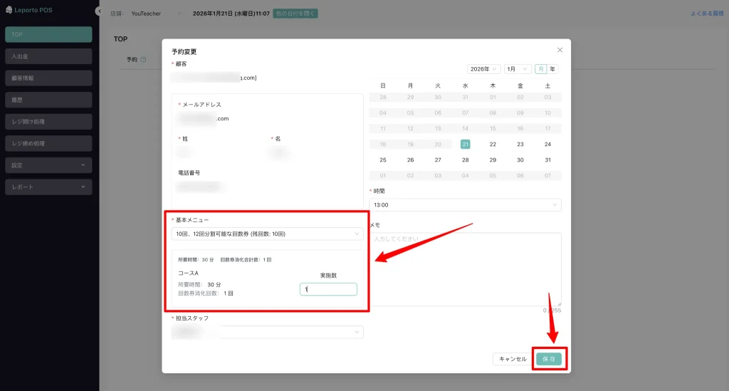 回数券メニューを選択、消化回数を入力、「保存」をクリック