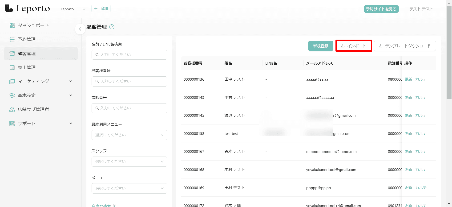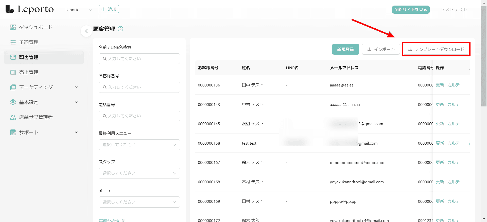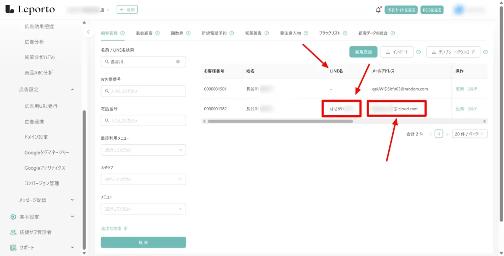 - 手順①②で登録した仮顧客データ:「***@random.com」や「電話番号+@leporto.com」のメールアドレス