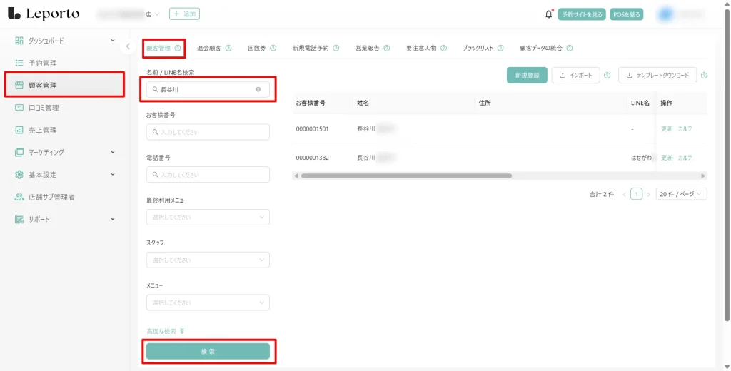 顧客管理 ≫ 顧客管理 ≫ 名前 / LINE名検索 に検索したい顧客名を入力し検索ボタンをクリックします。