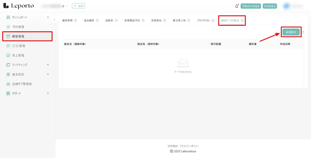 顧客管理 ≫ 顧客データの統合 ≫ 新規統合をクリック