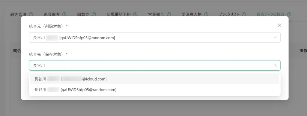 統合元(削除対象):「***@random.com」や「電話番号+@leporto.com」メールアドレスの仮顧客